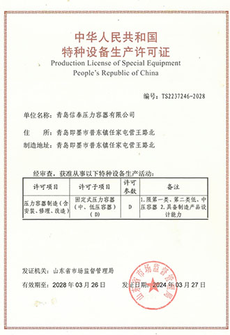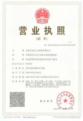 青島信泰壓力容器有限公司成立于2006年,由山東質(zhì)量技術(shù)監(jiān)督局頒發(fā)的D1D2類壓力容器設(shè)計(jì)許可證和制造許可證;并通過了國(guó)家質(zhì)量管理體系9001認(rèn)證證書;青島信泰主營(yíng)的產(chǎn)品有:各類壓力容器,儲(chǔ)氣罐:空氣儲(chǔ)罐,蒸汽儲(chǔ)罐,氧氣儲(chǔ)罐,及各類不銹鋼儲(chǔ)氣罐、油罐等。